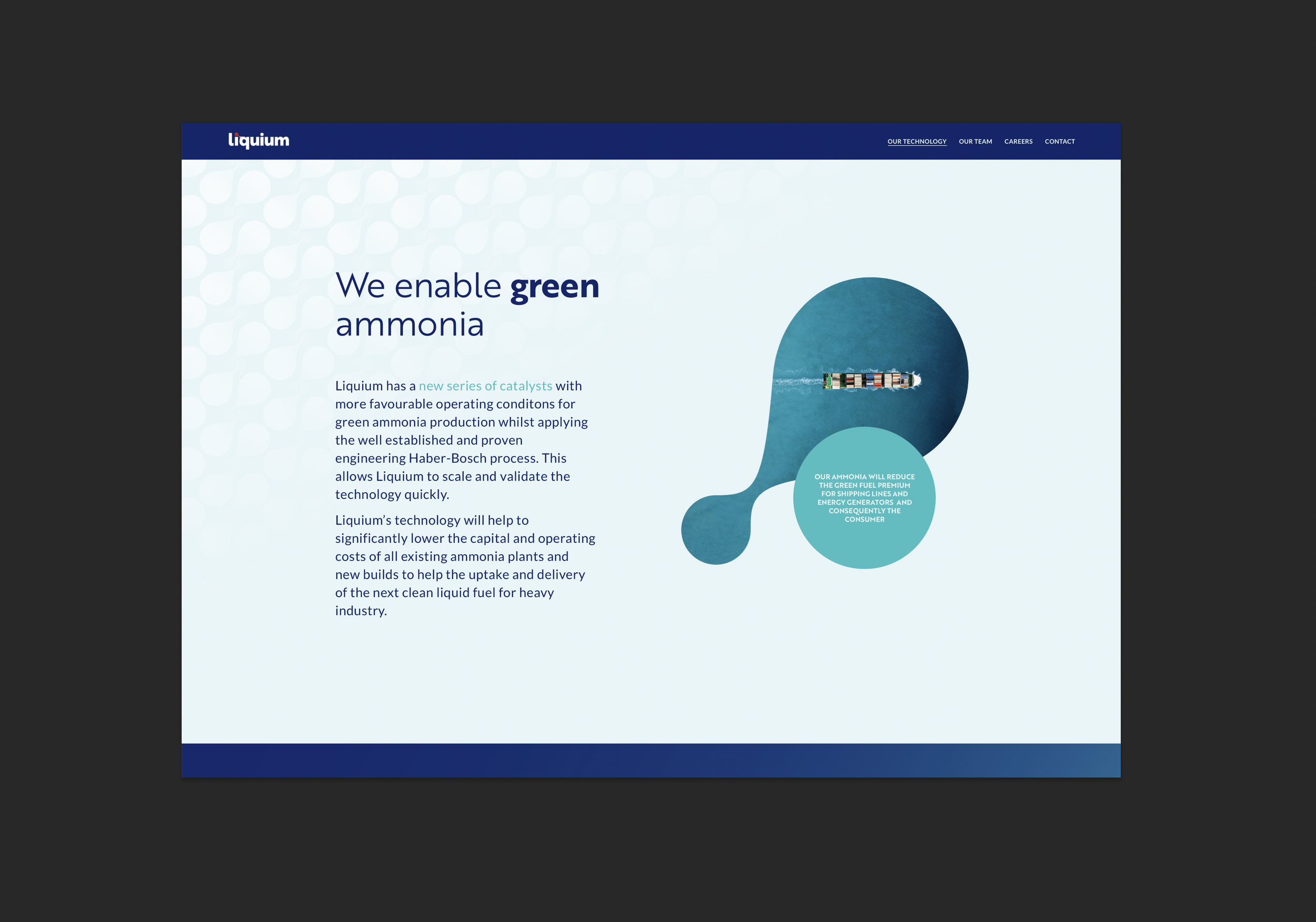 Liquium reimagines a future where clean ammonia will be pivotal to decarbonisation and energy security. It was this transformative vision that inspired the look and feel of this identity. Applications ranged from a website to PowerPoint templates.
